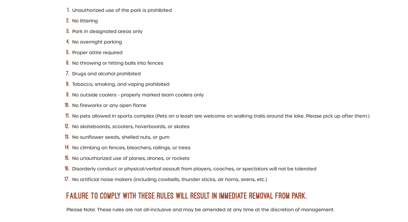 To see a park map, field locations and rules press photos on this site and select the park map photo for information.
