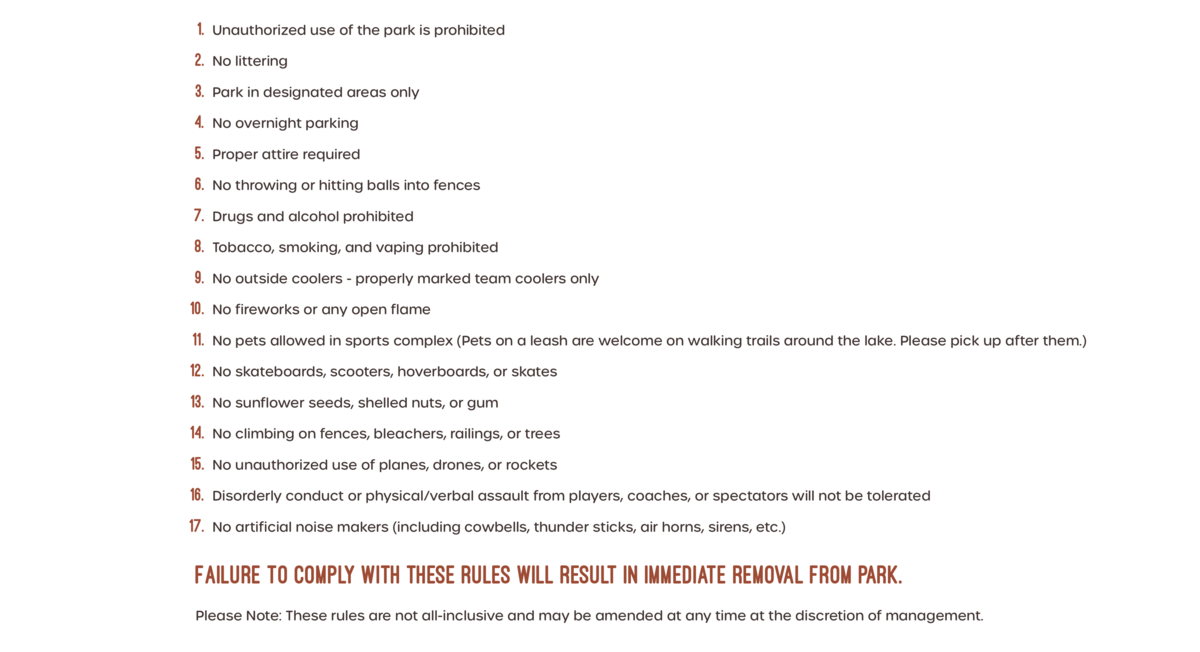 To see a park map,field locationsand rules press photos on this site and select the park map photo for information.
